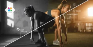 ภาพแสดงการออกกำลังกาย HIIT เพื่อเผาผลาญไขมัน พร้อมความแตกต่างของร่างกายที่ฟิตและไม่ฟิต